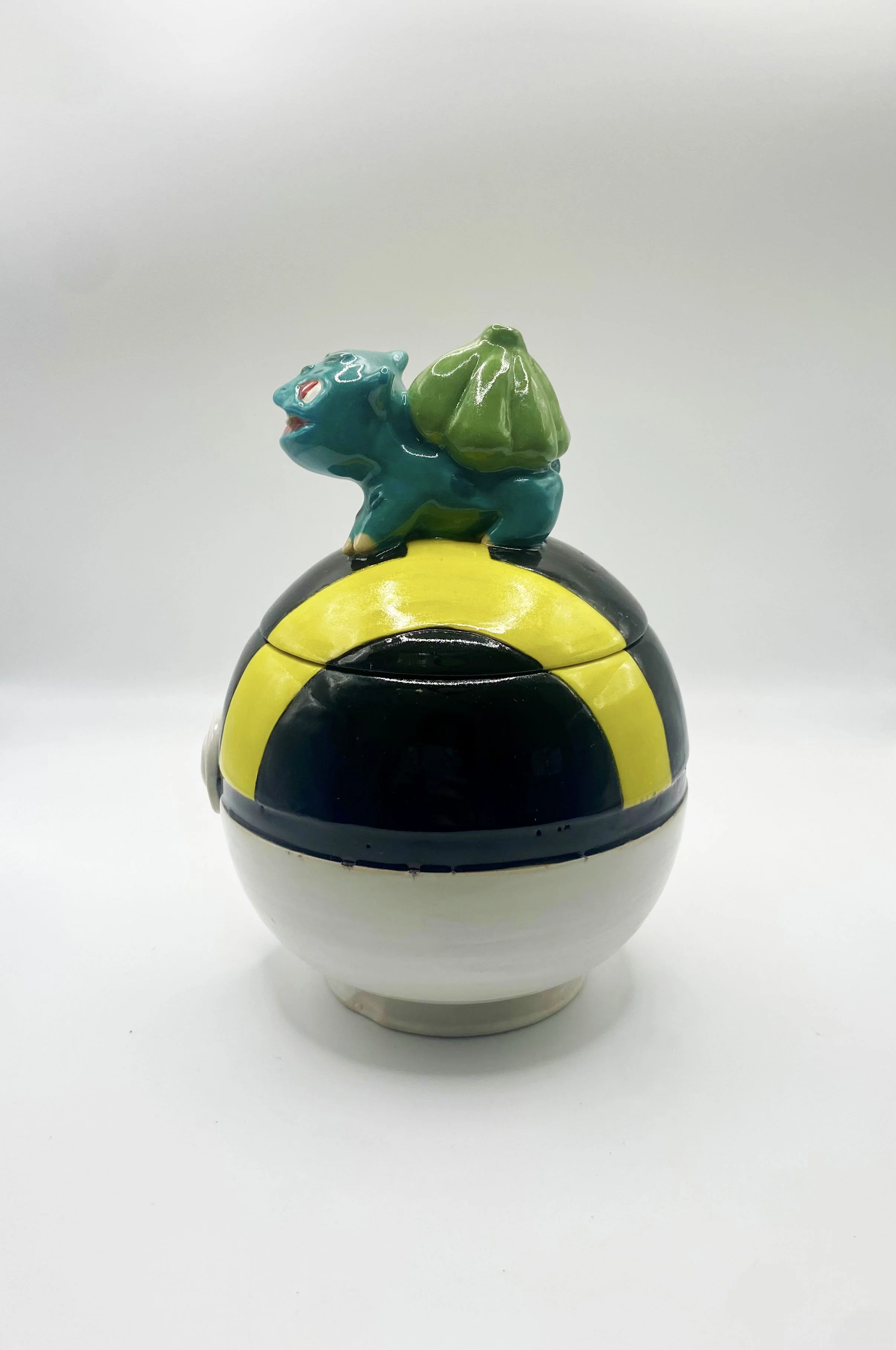 Wheel thrown ultra ball topped by a delicately sculpted Bulbasaur. Measures approximately 6.5” tall and 4” wide. Price includes free shipping within the US.